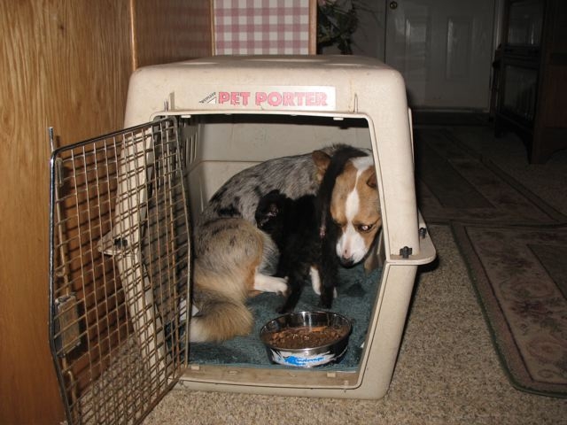 Attached are two pictures of Phoenix and her cat, Roy. Roy eats with Phoenix at every meal and constantly follows her around–he is convinced that since she paid so much attention to him in trying to chase him that she must love him. He does not give her a moment’s peace when he is in the house, and I figure she is getting her just deserts.