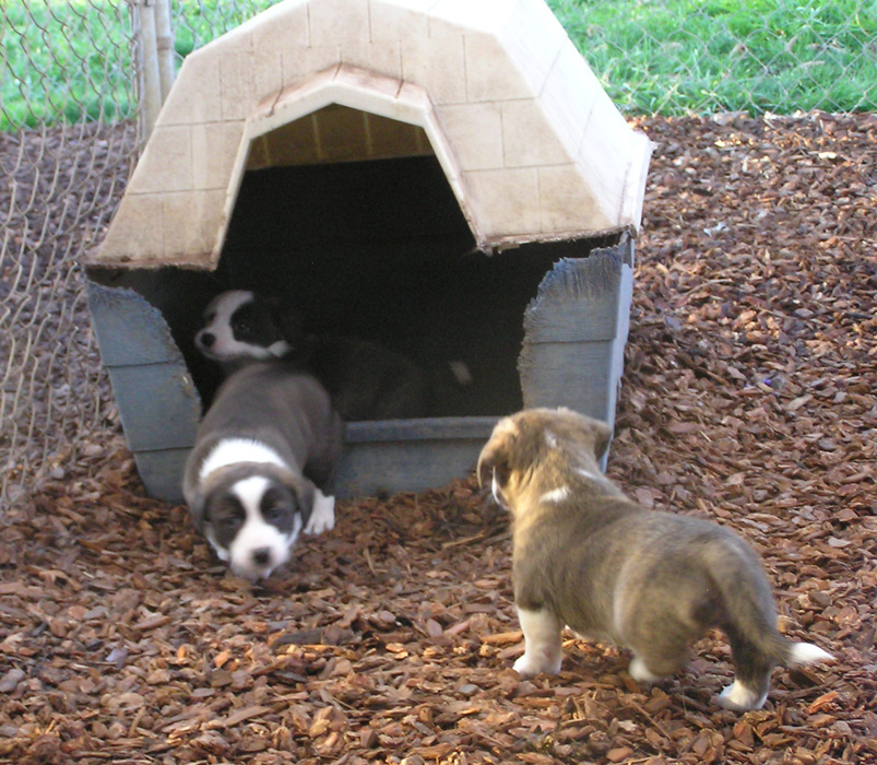 It was almost warm this afternoon. Almost. So I decided to let the puppies go outside for a little while. Being nervous about hawks and real eagles (as opposed to the eaglet) I put them in one of the runs so that they were covered.