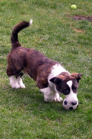 “Ace is a very smart, sweet, athletic and handsome young dog -“a strapping youth.” He was over 30 lbs at 6 mos; probably over 35 lbs by now. Although they’ve grown slightly more proportionate with time, his great big white front paws are still one of his best features. His favorite games are Frisbee and soccer (it is marvelous the way he herds soccer balls as though they were miniature Holsteins…), and he had a great time on a recent family hike/picnic on the dikes/marshlands of the Skagit Delta. I wish I had photos from that trip – he tried out his agility skills (not yet strong) on the many drift logs, regularly falling off and even getting stuck between two logs at one point (these logs are completely stationary – unlike the dangerous beach logs out on the Pacific beaches). The tall marsh grass was another adventure – he would run ahead and, when we whistled for him, he would jump up so we could spot his ears and tail over the grasses. And then there was the beach itself – his favorite water activity is wading in to where the water is a few inches over his head and then paddling around until those big paws touch the bottom again.
