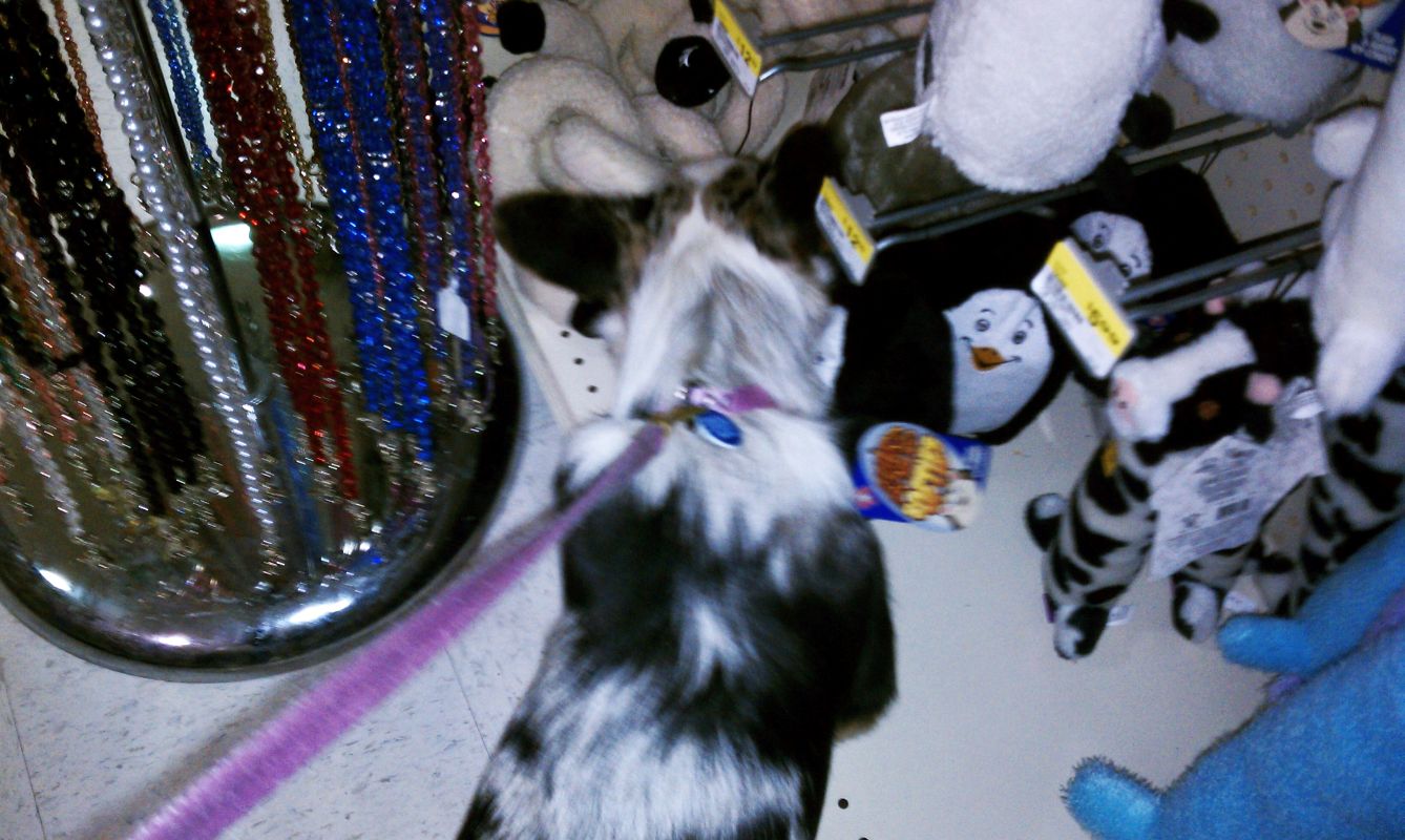 Earlier this morning, I took Kady to Pet Country for her rabies shot and county license. Six months old: she’s a big girl now. I wanted to get some pictures of her making friends in line, but holding the madly bouncing puppy, filling out the paperwork, and taking pictures simultaneously was another thing that was not happening. But here she is shopping after the shot: