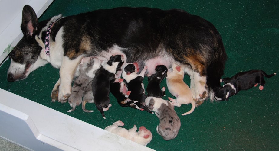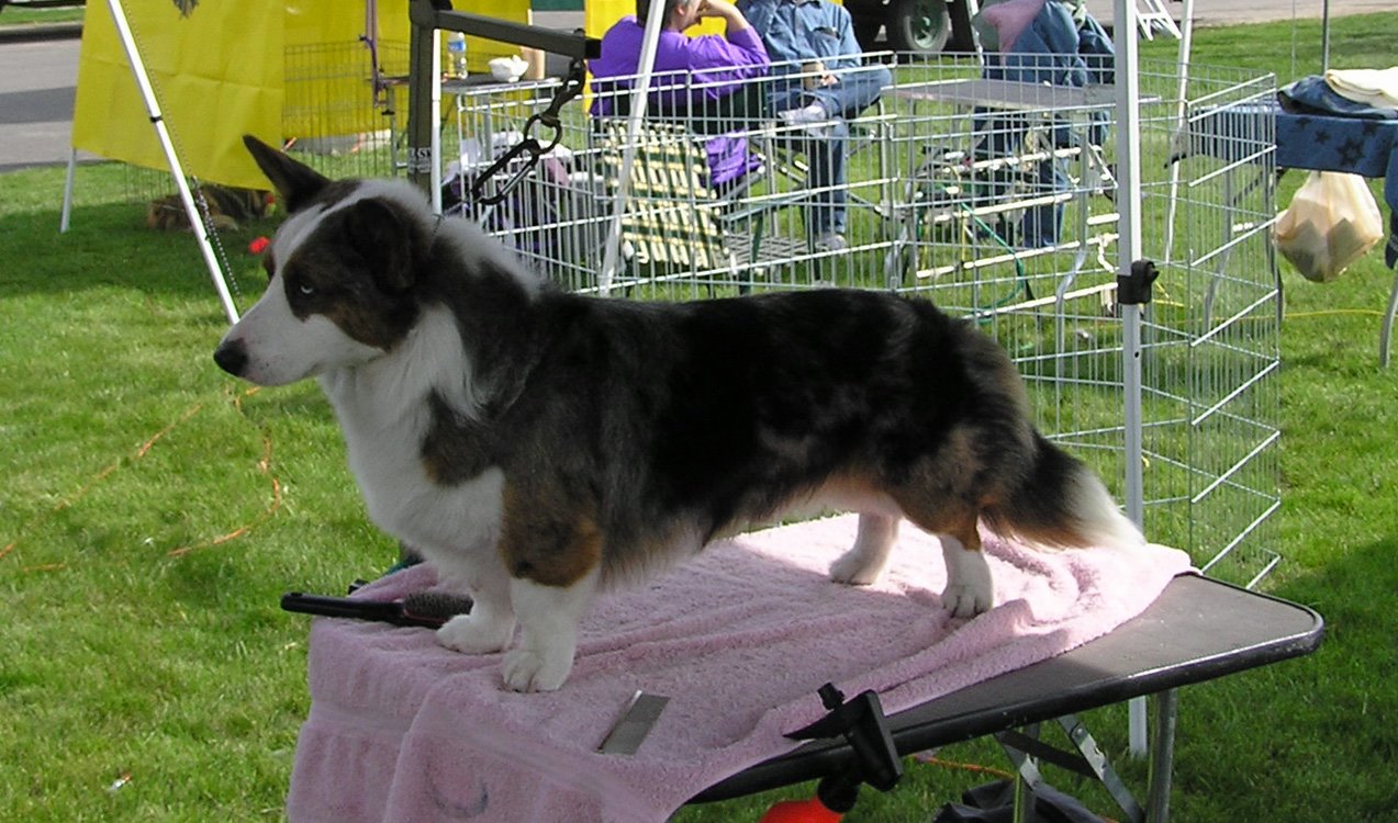 Pilot is growing up. Here he is at 6 months, 1 week, 2 days old. He was best Bred-by exhibitor Cardigan both days over 4 bitches, and Group IV bred-by on Saturday with 8 breeds showing. Mandy and Henry elected not to stay for bred-by groups on Sunday since Wally didn’t win and I don’t blame them.