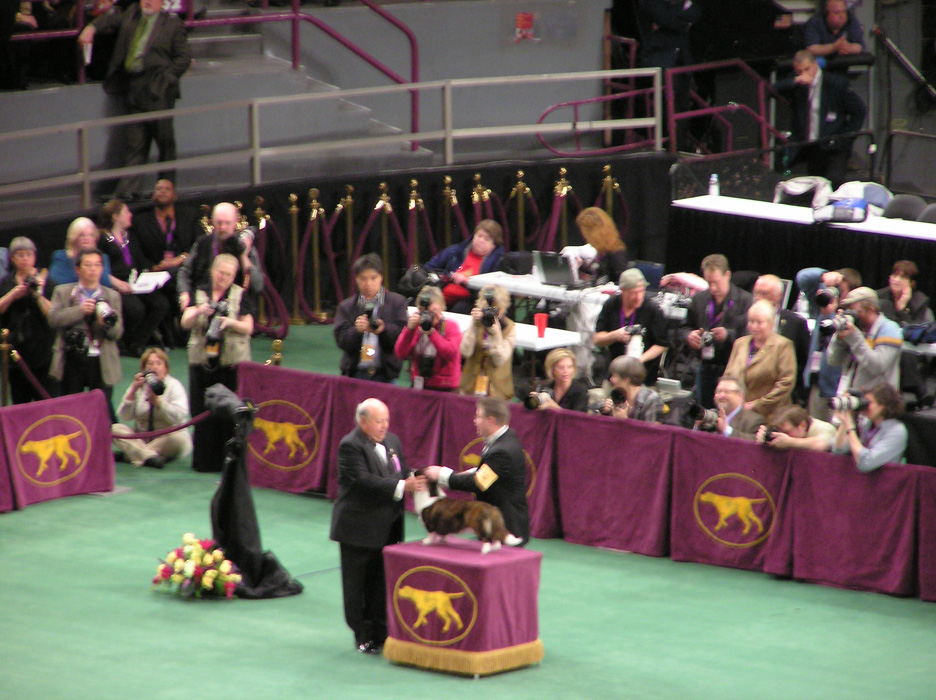 Patrick with Autumn on the table. You can see the big camera that gets the close-ups of the dogs in this picture. The people in the gallery at the end are all press, with laptops and cameras busily at work.