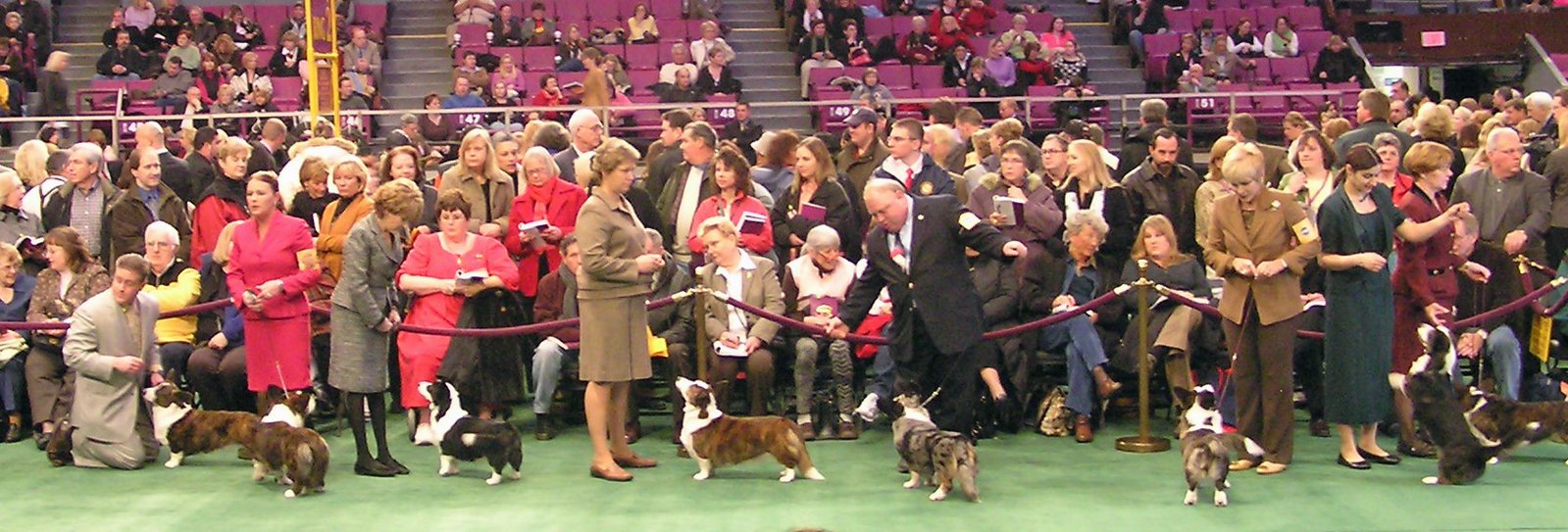 Cardigan line-up. There were bigger rings and smaller rings. The Vallhunds were in a big ring; go figure. The Cardigans had one of the four small rings, too small to be able to adequately judge side-gait IMNSHO. The judge pretty much had to rely on silhouette and what he could see going and coming. Being a side-gait and a shoulder fan myself, this left a lot to be desired.