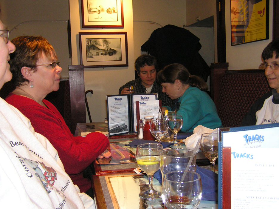 After Vallhund judging, several corgi-l people got together and went out for lunch. I learned some things about New York. I learned that there is a underground city which does not require that you go out into the cold. We had lunch at Tracks in Penn Station. Penn station lies underneath Madison Square Garden. There is a level for subways, and a level for shopping and eating, and below that a level for the trains.